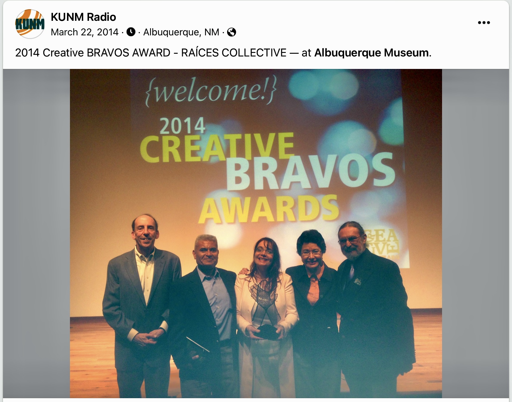 The RAÍCES COLLECTIVE of KUNM 89.9 received the CREATIVE BRAVOS AWARD 2014. I felt honored to receive this award as part of the Collective. Being the Programming & Production Coordinator (2012/2013), and ESPEJOS DE AZTLÁN Coordinator (2013-Present), I felt that this Award recognized an innovative, and creative approach to the Latino public affairs, and culture in the mass media.