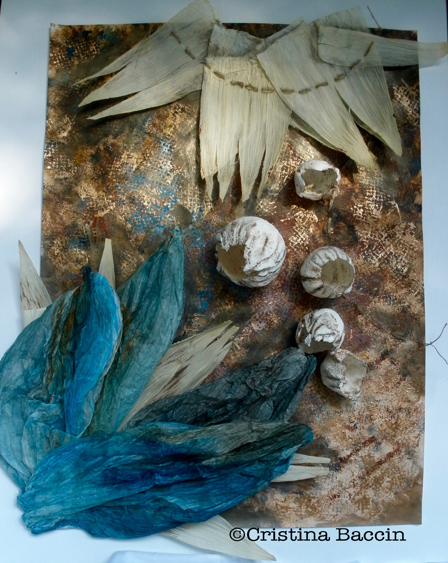 En “Espirare”, valorizo dos materiales de la vida cotidiana: papel higiénico y chala (u hoja de maíz) para generar una expresión sobre uno de los aspectos más vitales y espirituales del ser humano: respirar. El trabajo es parte de la serie “Respirare”.