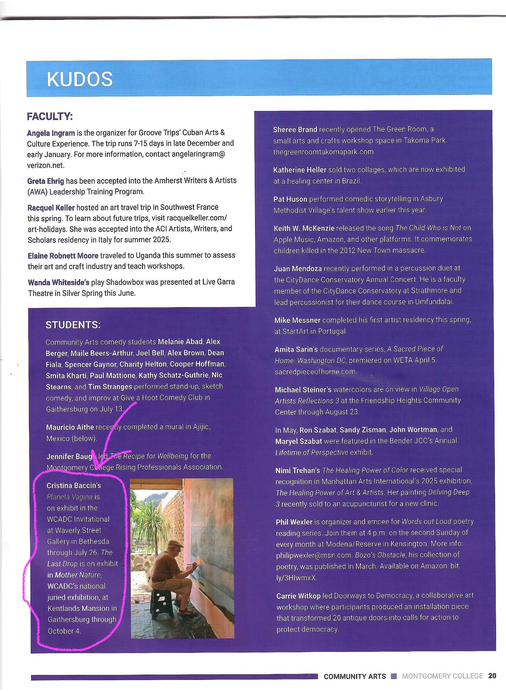 “Planeta Vagina” in exhibition by the WCADC was featured in the 2025 Fall 2025 Montgomery College Arts Catalog (see pictures below). The publication reaches nearly 10,000 households, plus libraries, art centers, community centers, MC locations, and more.