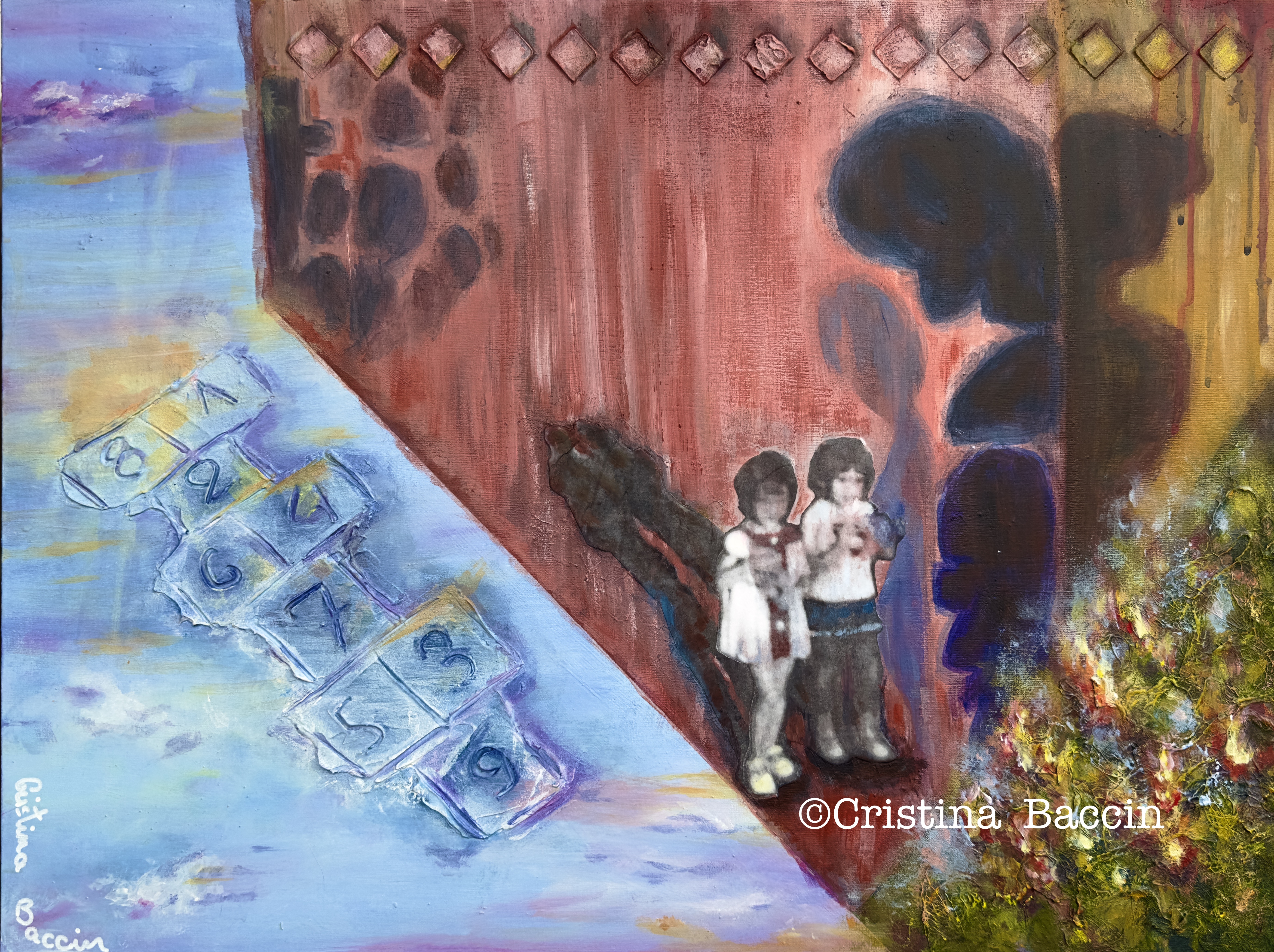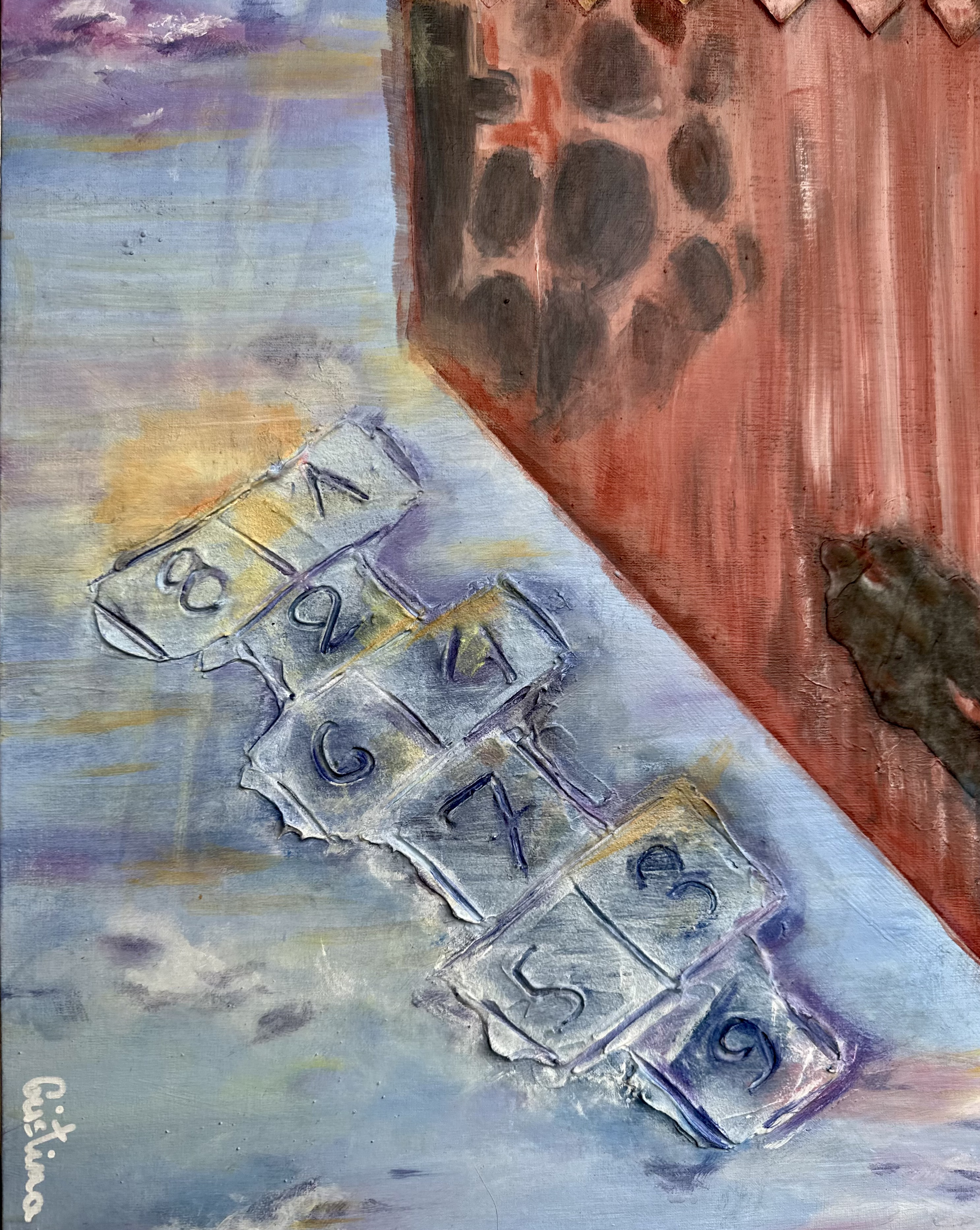 This painting progressed as I worked on translating into Spanish two books on adverse childhood experiences, which triggered a review of childhood memories and a thread of communication with some of those children. The composition summarizes visually some of those conversations. A house with the roof upside down locks the girls with the shadows of adults and a community muted by social control and the Catholic Church. On the “outside” of that upside-down house, puna grass fire begins to grow, a grass that is characterized by high resistance to inhospitable conditions. It represents the resistance and courage necessary to get out of adverse situations. A hopscotch game hangs in the sky, faintly luminous: jumbled numbers show a hard-to-win game for the children, but still, with hope.